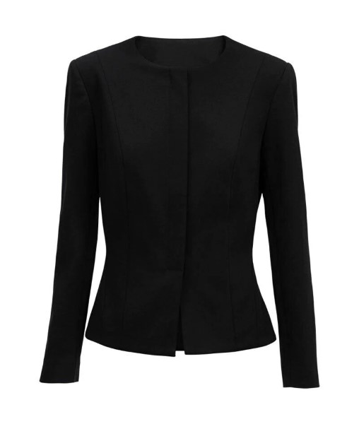 Collarless round neck jacket with flattering peplum waist detail at hem